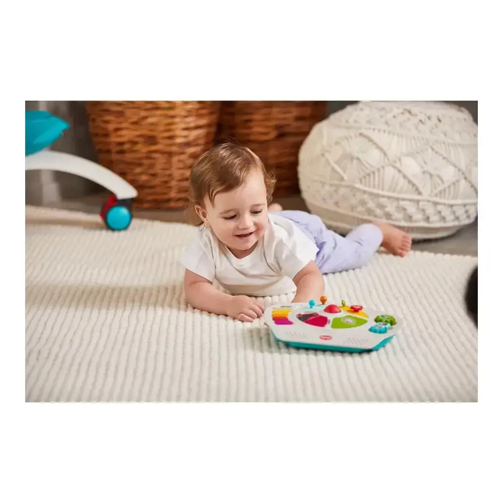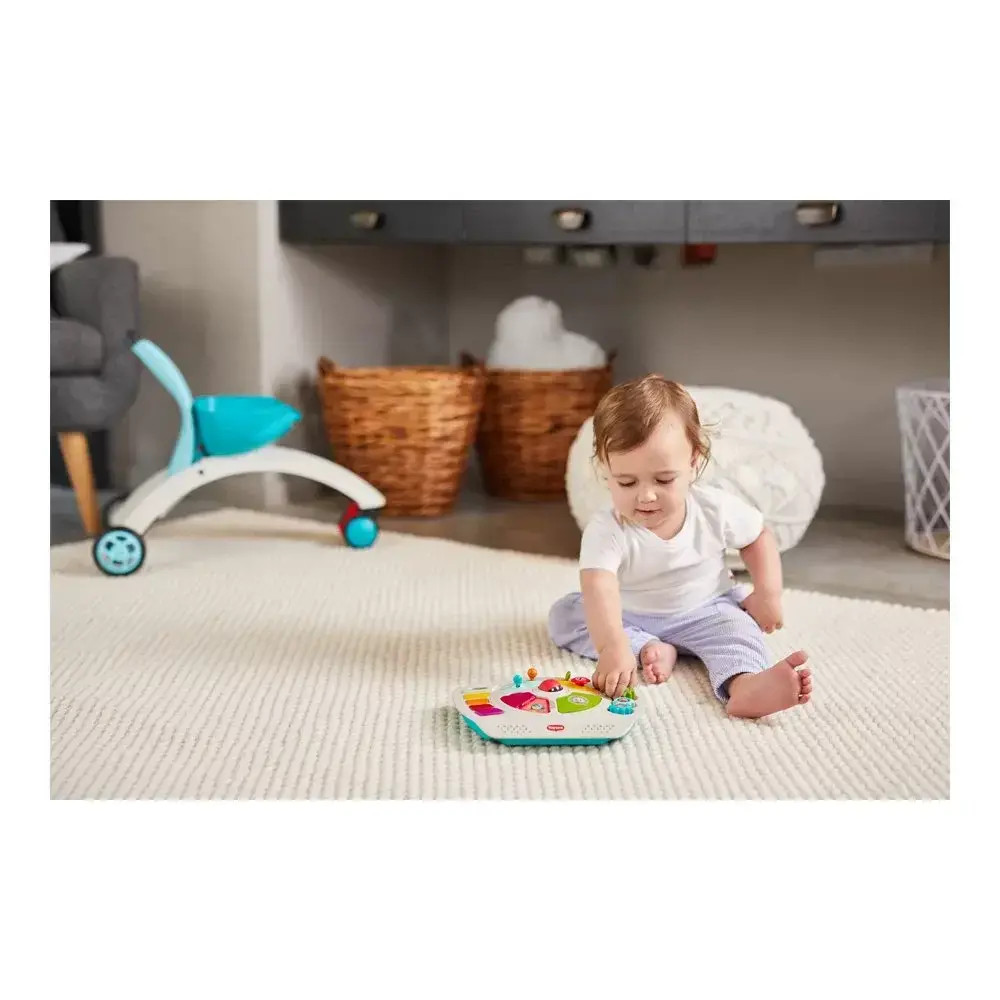 - 6 месеца + Игра в седнала позиция - Бебето ще се наслаждава на цветния електронен панел и всички негови функционалности, които насърчават фините двигателни умения и когнитивното развитие – светлини, мелодии, въртящо се топче с мъниста, елемент повдигни и намери, безопасно огледалце, разнообразни цветни бутони;