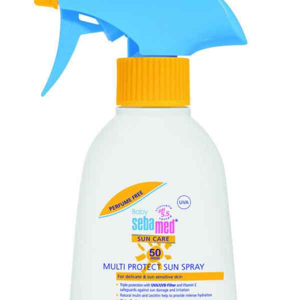 Бебе слънцезащитен спрей SPF 50 на Sebamed без парфюм, предотвратява увреждания от слънцето, кожни раздразнения и предпазва от изсушаване деликатната кожа на бебето