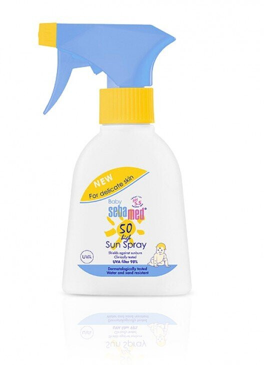 Детски слънцезащитен спрей SPF 50 на Sebamed, предотвратява увреждания от слънцето, кожни раздразнения и предпазва от изсушаване деликатната кожа на бебето