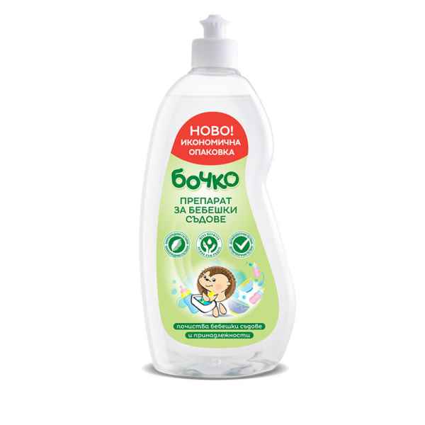 Меката почистваща формула на препарата Бочко ефективно отстранява остатъците от мляко и храна от бебешките съдове и принадлежности (биберони, залъгалки, шишета, миещи се играчки)