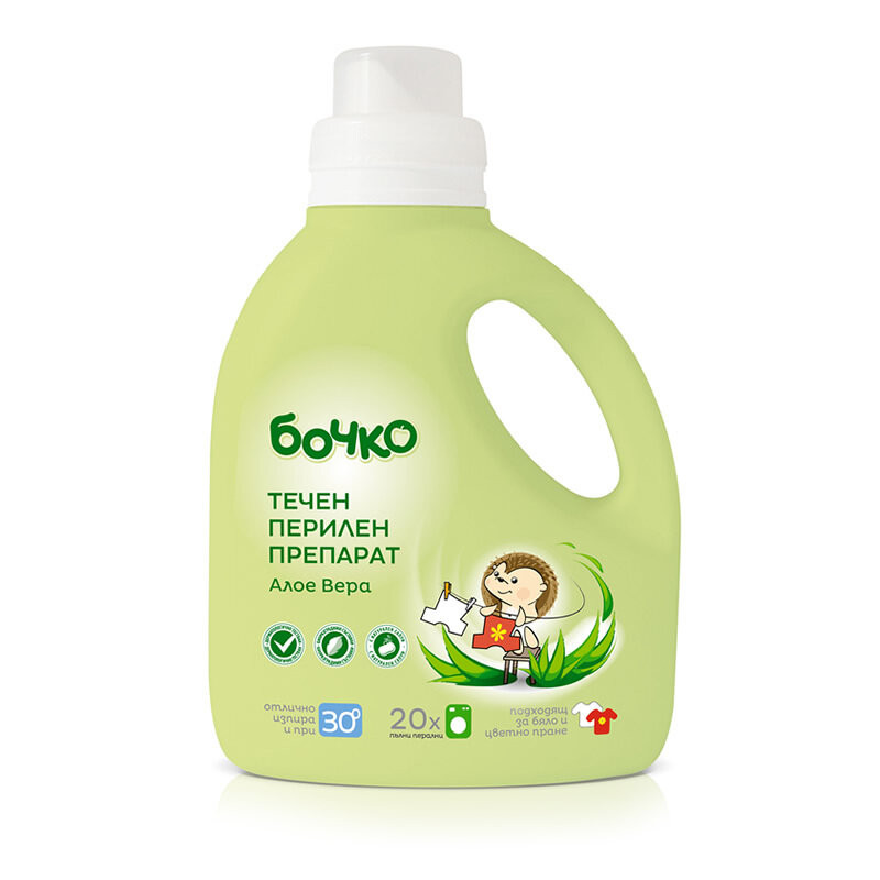 Нежната формула на течен перилен препарат Бочко е с вложен натурален сапун