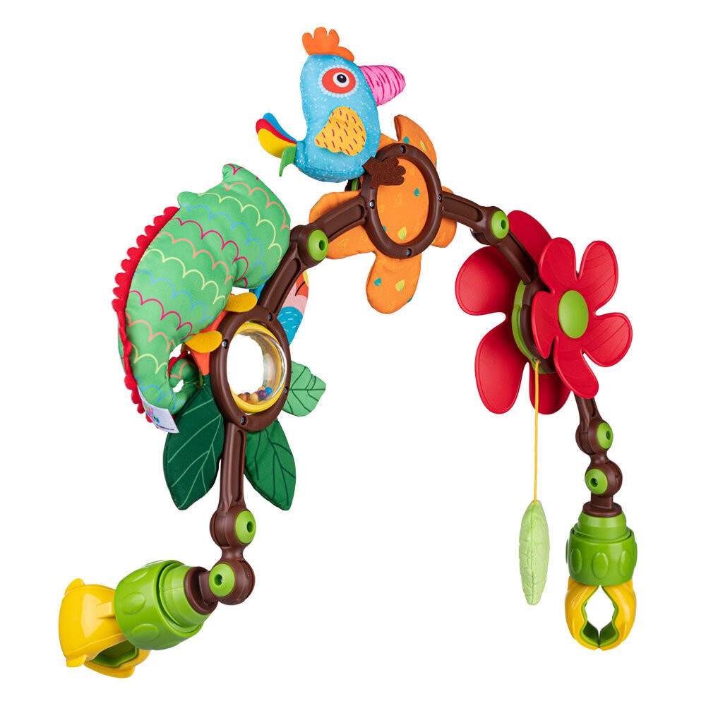 Цвете- въртящо колело, шумолящи елементи, различни материи, дрънкалка, клипсове за лесно фиксиране, огъващи се фиксиращи елементи с възможност за поставяне под различни ъгли