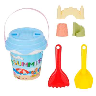 Плажният комплект включва кофичка, сито, мелница, гребло и лопатка.