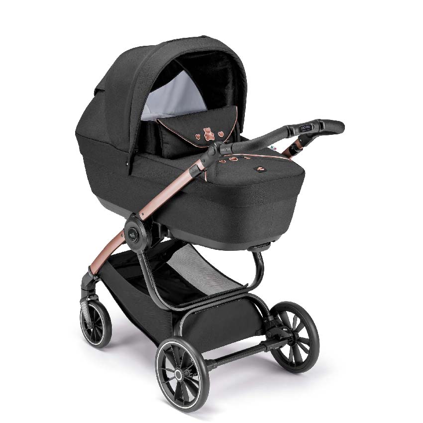 Кош за новородено: - Широк и удобен; - Подходящ е за бебета с тегло до 10 кг.; - Оборудван със системата за лесно монтиране и отстраняване; - Височината на главичката може да регулирате в три позиции; - Меко матраче, подплата, покривало за крачета и комарник; - Основата може да се люлее и е вентилираща;