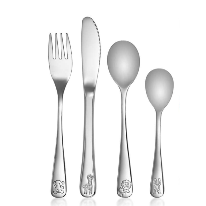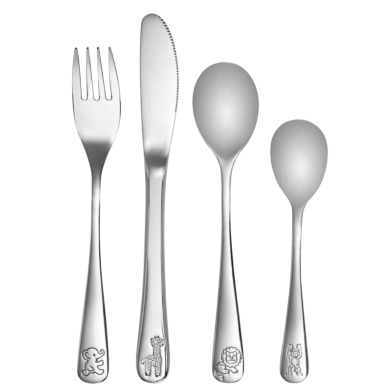 Луксозен комплект, който включва 4 детски прибора от закалена стомана, които са перфектната алтернатива на пластмасата;