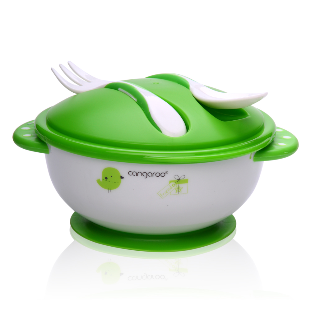Бебешки и детски магазин "СЛАДУРЧЕТА" и марката "Cangaroo" представят на Вашето внимание купа за храна с лъжица и вилица със следните характеристики: