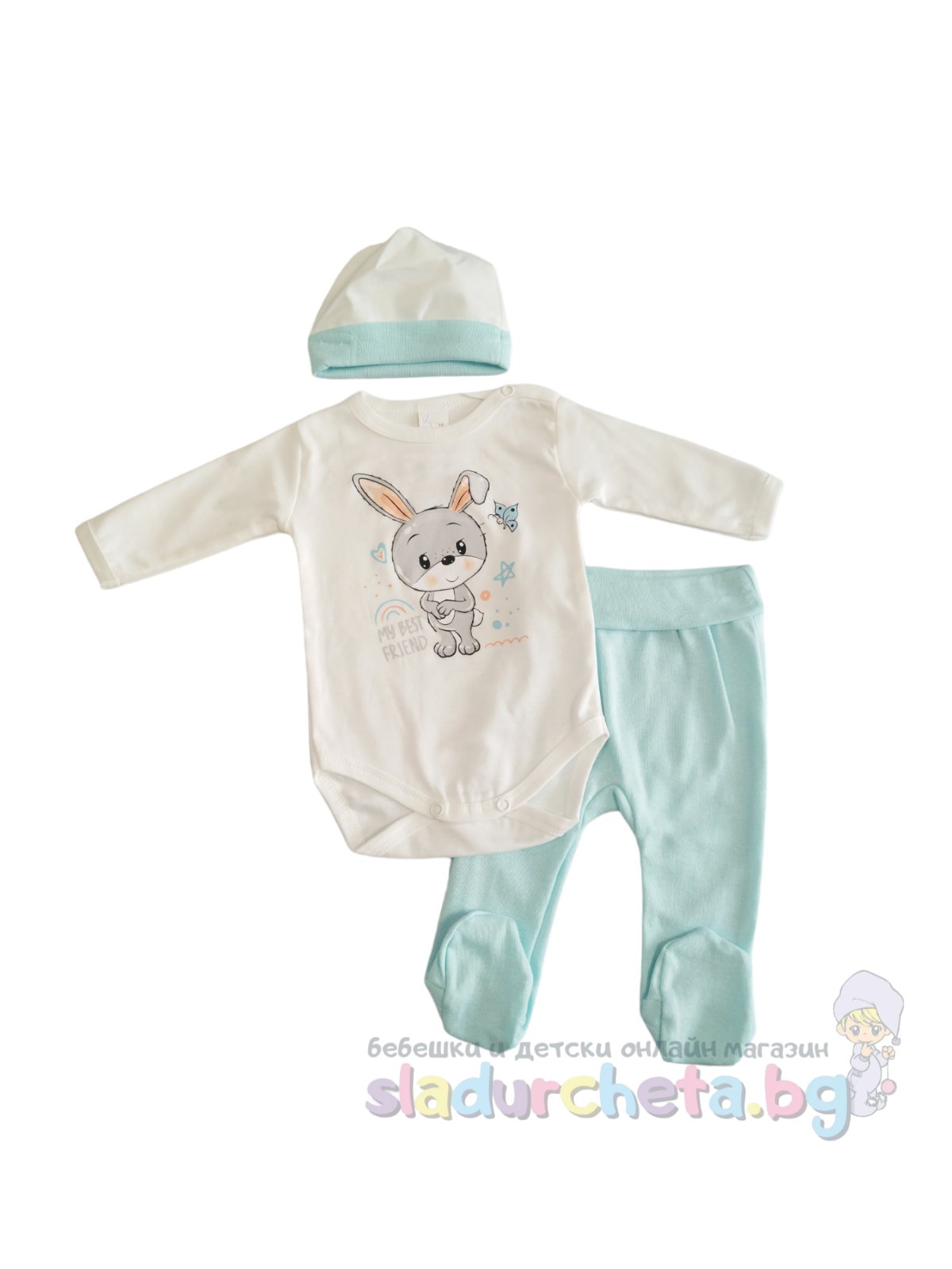 Бебешки и детски магазин "СЛАДУРЧЕТА" и марката "Светли" представят на Вашето внимание бебешки комплект от три части със следните характеристики: