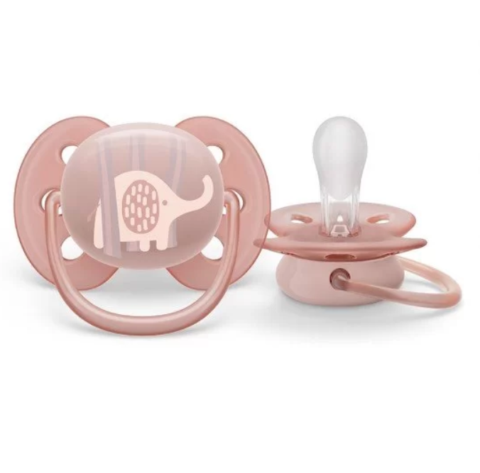 Ортодонтични залъгалки Philips AVENT Ultra Soft 0-6, с декорация Слонче и Палми в кутия за стерилизиране, 2 бр.