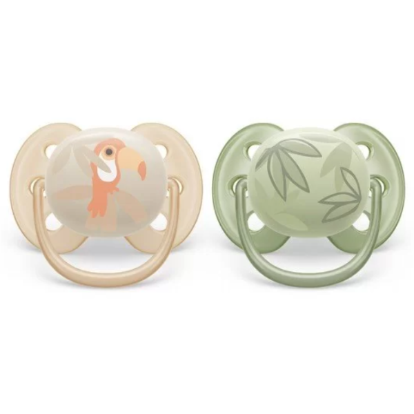 Ортодонтични залъгалки Philips AVENT Ultra Soft 0-6, синя с декорация Тукан и Листа в кутия за стерилизиране, 2 бр.