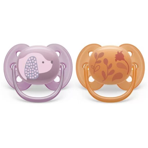 Ортодонтични залъгалки Philips AVENT Ultra Soft 0-6, с декорация Куче и Цвете в кутия за стерилизиране, 2 бр.