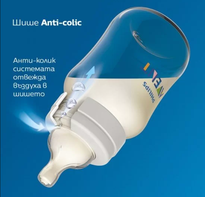 Уникална система против колики, при която въздухът отива в шишето, а не в стомахчето на бебето;