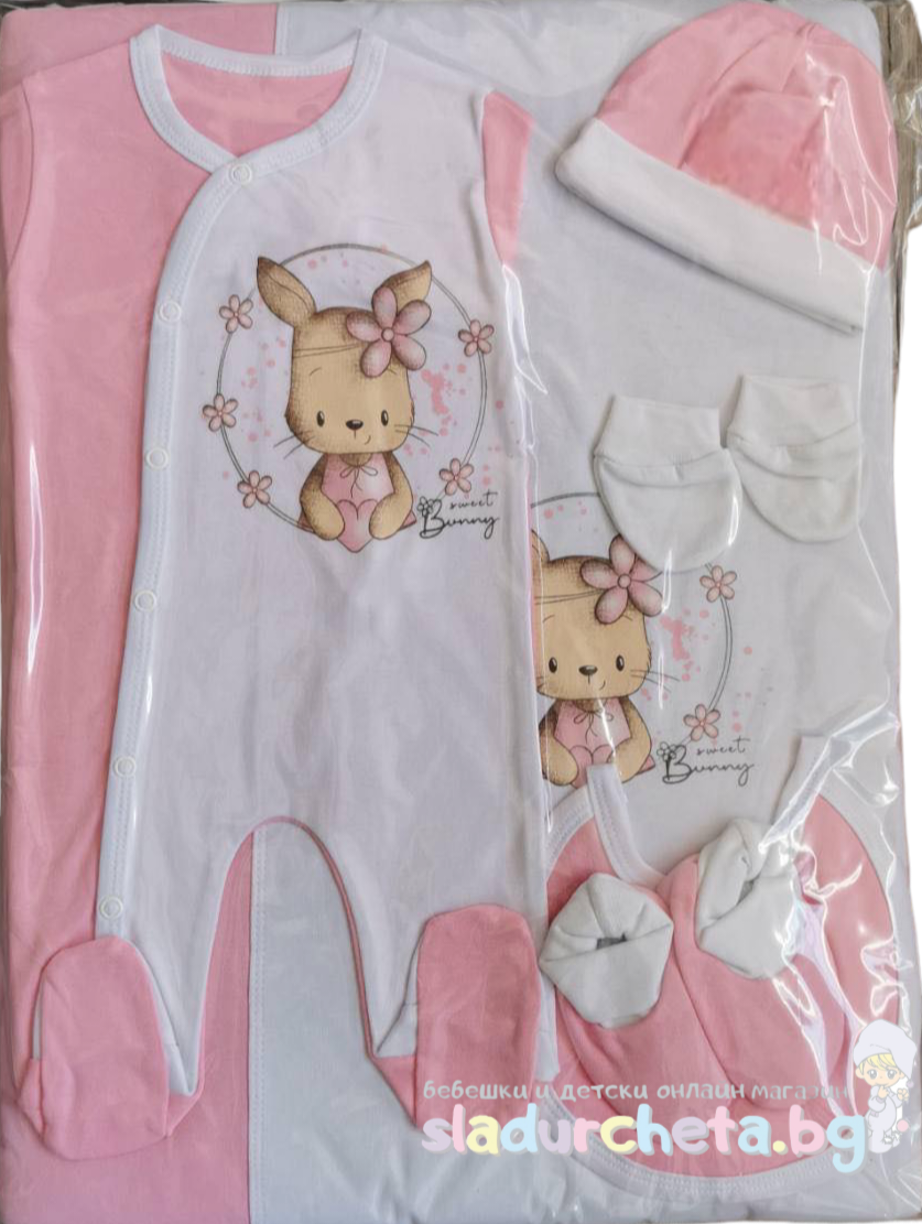 Нежна материя и цветен розово-бял дизайн с апликация на зайче с цвете;