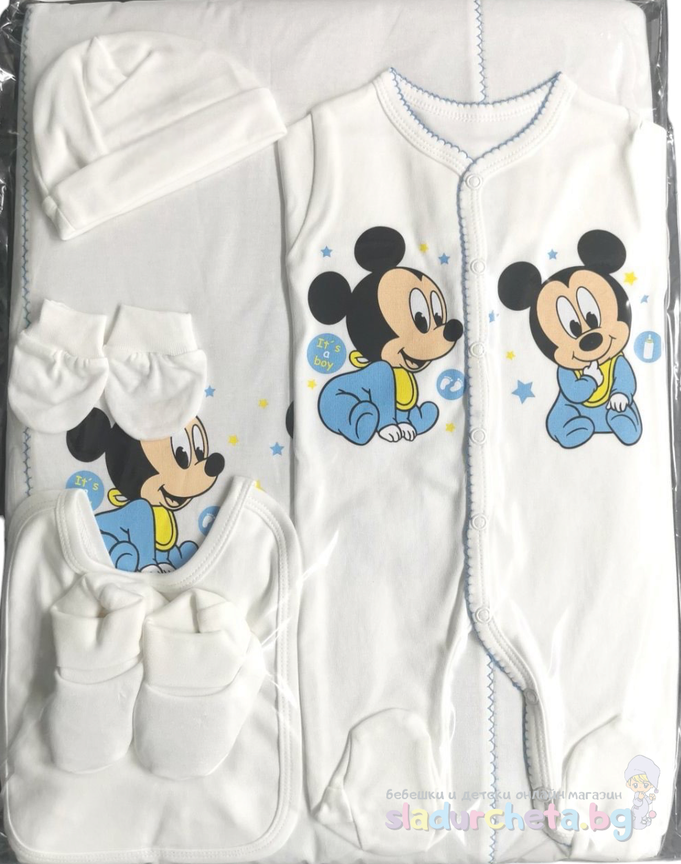 Нежна материя и бял изчистен дизайн с апликация на Мики Маус;