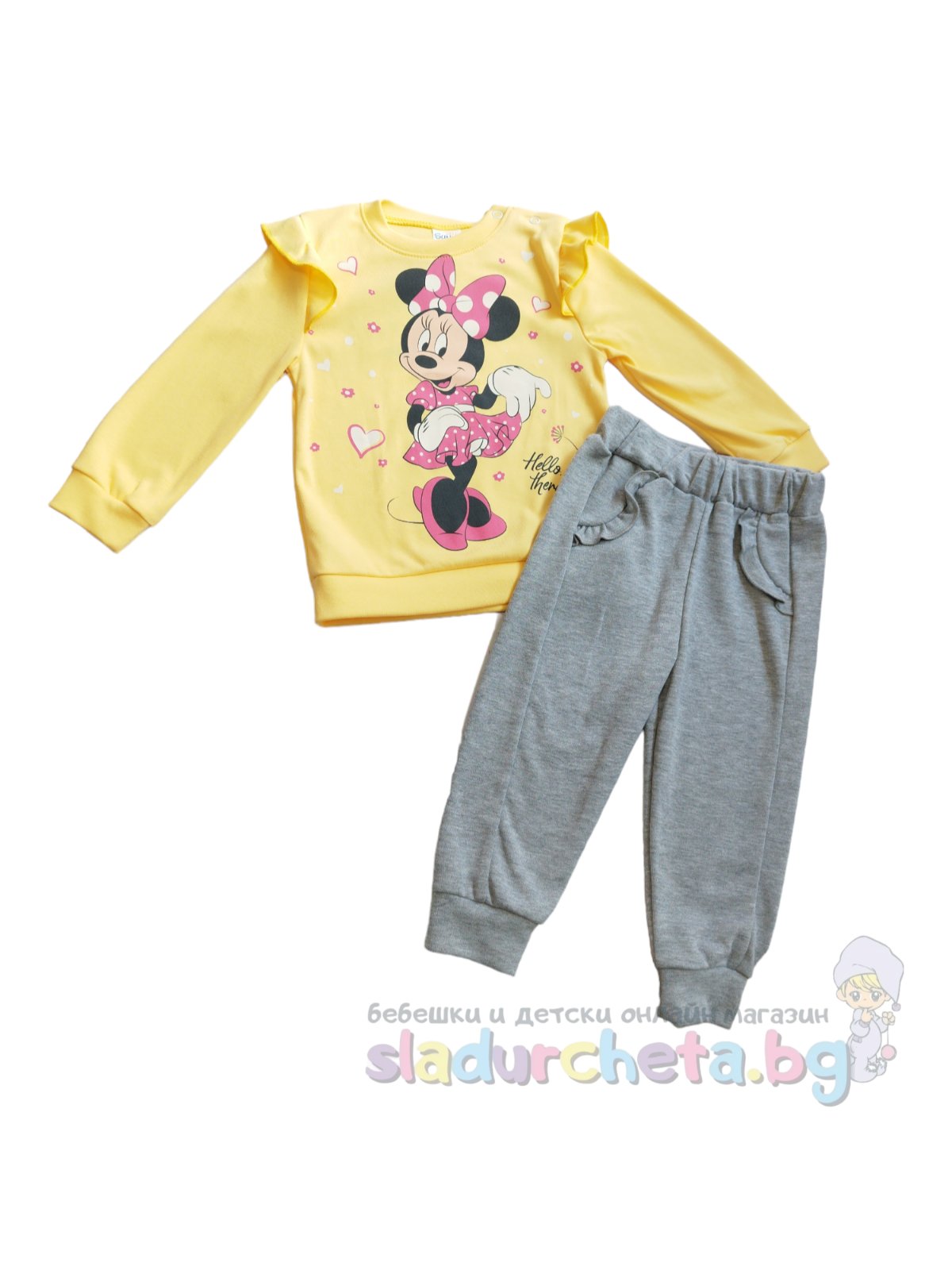 Блузата е с дълъг ръкав и къдрави акценти на рамената в жълт цвят с цветна апликация на Мини Маус и щампа на сърца;