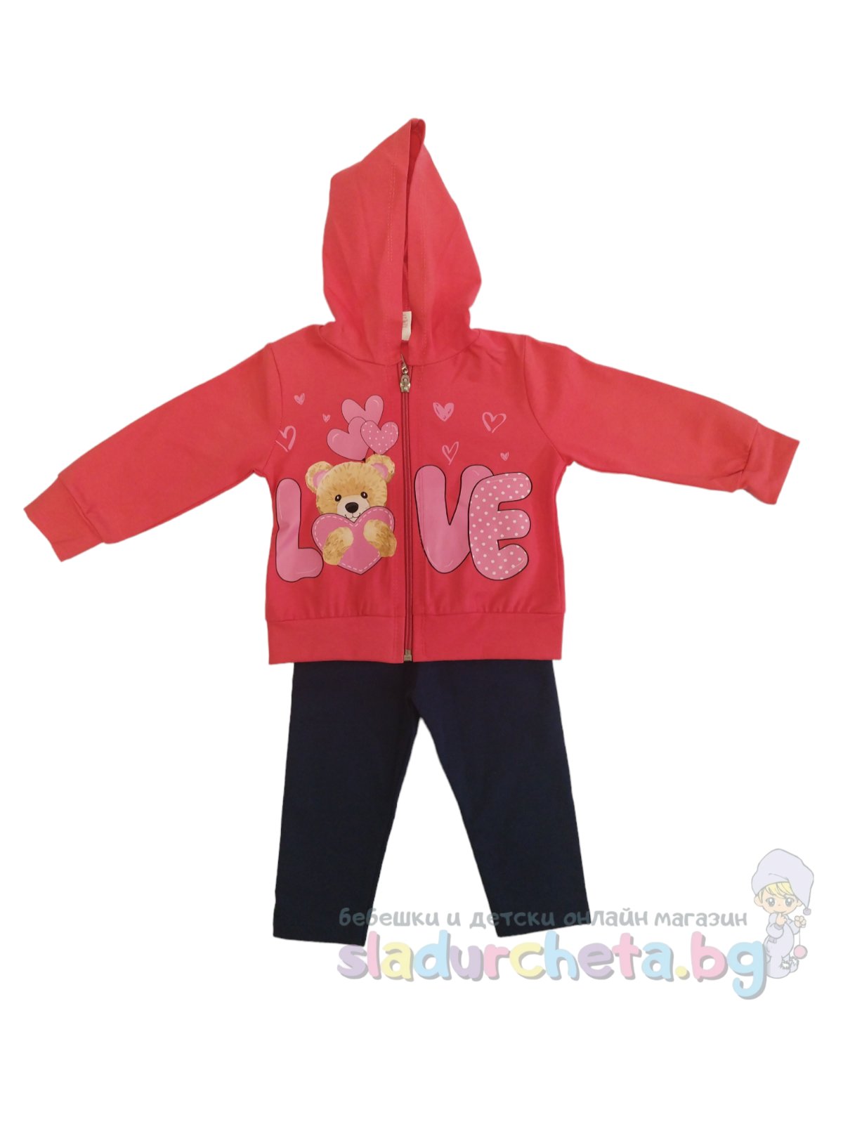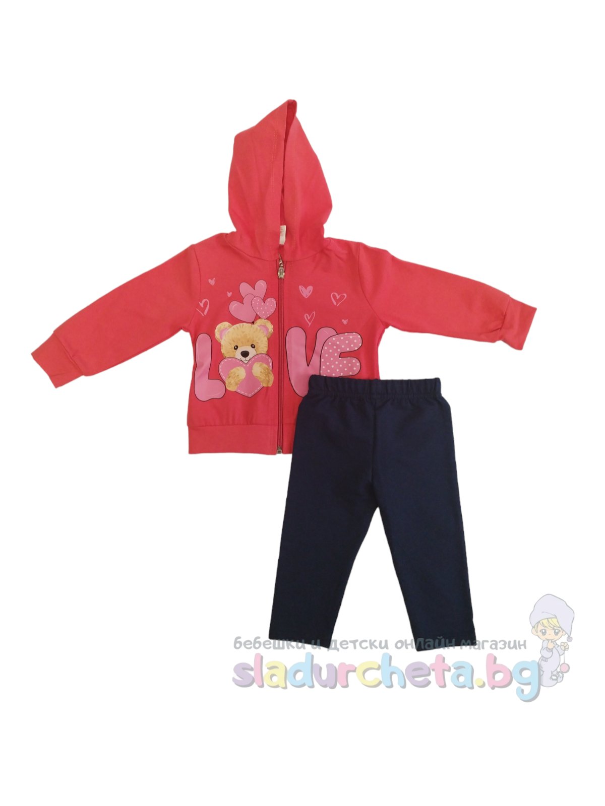 Суитшъртът е с дълъг ръкав и качулка в цвят малина с апликация на мечета и надпис;