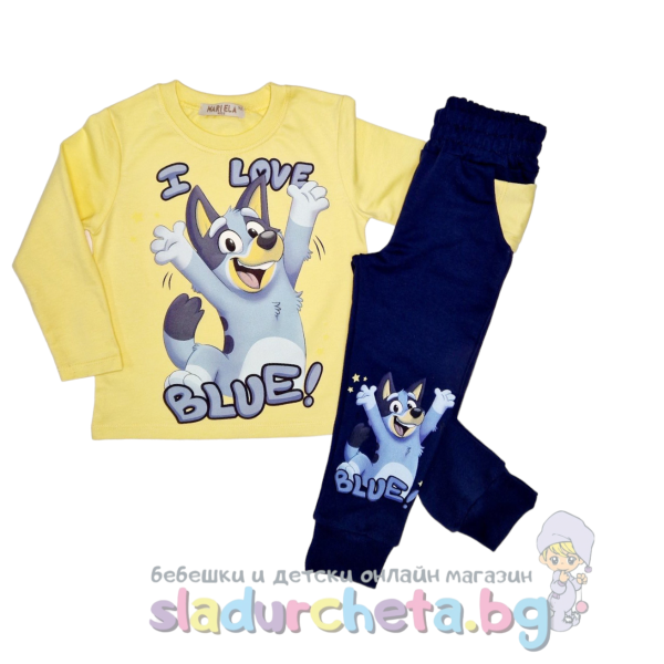 Панталонът е с два джоба в тъмно син цвят с апликация на Блуи и ластична част на талията;
