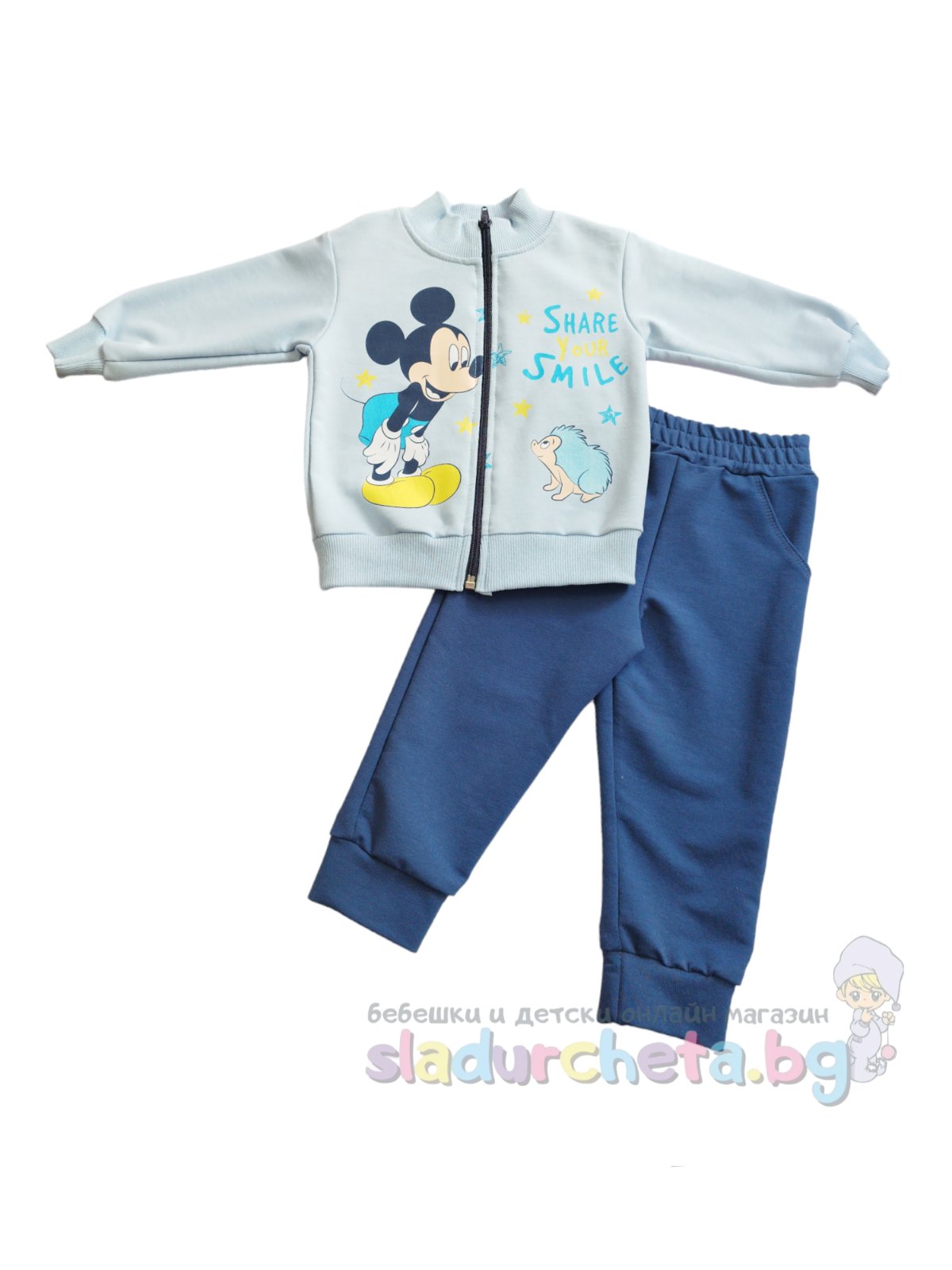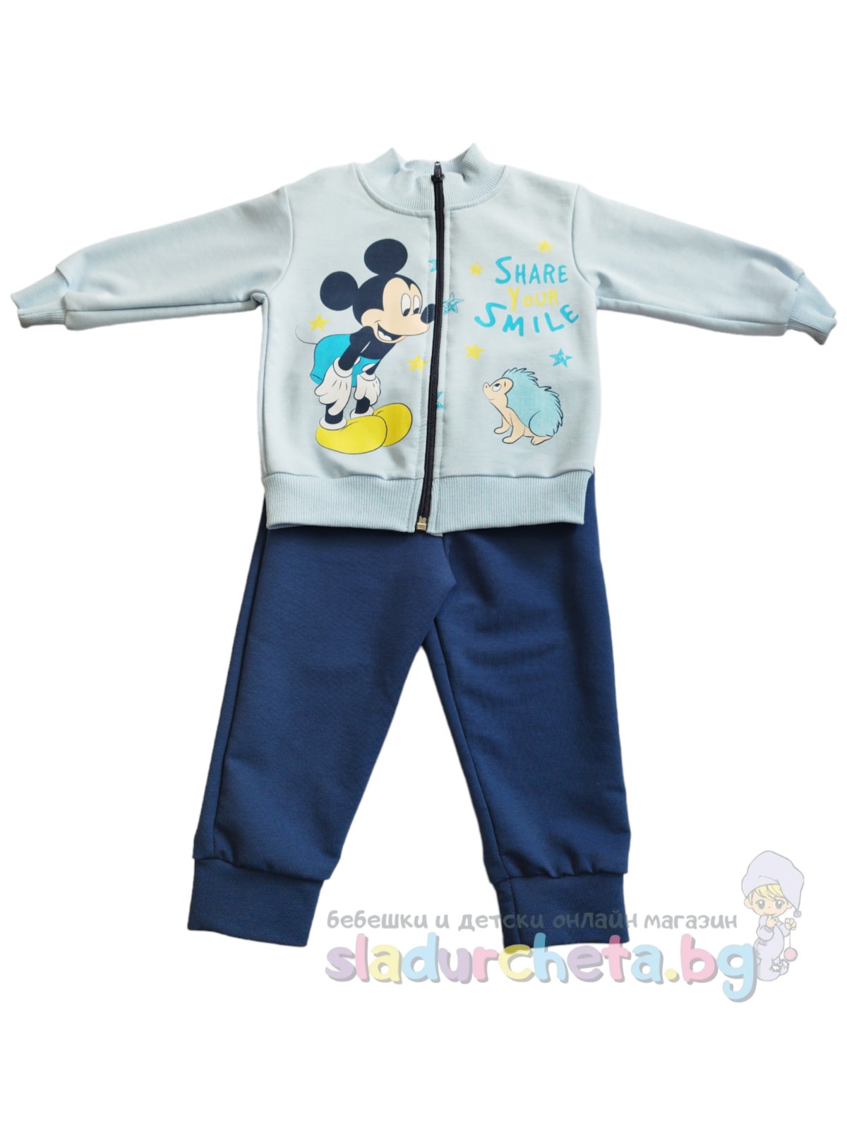 Суитшъртът е с дълъг ръкав в светло син цвят с апликация на Мики Маус;