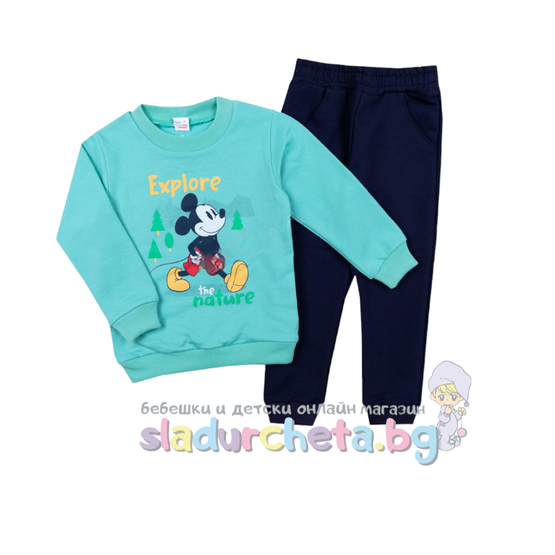 Блузата е с дълъг ръкав в светло син цвят с апликация на Мики Маус;
