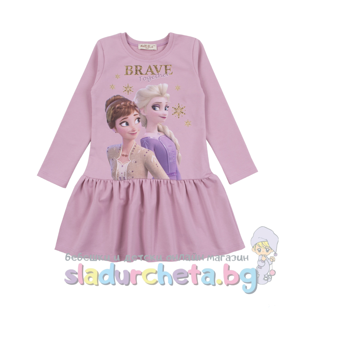 Роклята е с дълъг ръкав и ниска талия в лилав цвят с цветна картинка на любими герои - Анна и Елза;