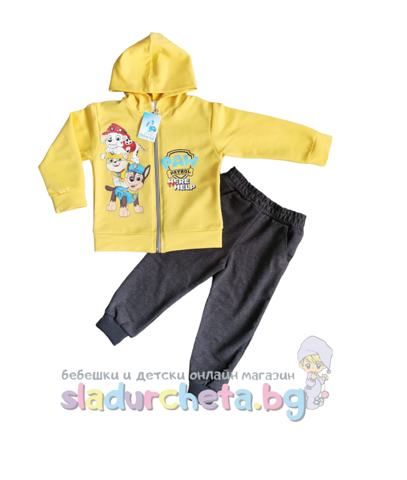 Суитшъртът е с качулка, с дълъг ръкав в жълт цвят с апликация на кученцата от Пес Патрул;