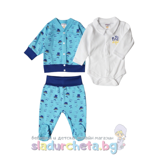 Бебешки и детски магазин "СЛАДУРЧЕТА" и марката "Морисмо" представят на Вашето внимание бебешки комплект от три части със следните характеристики: