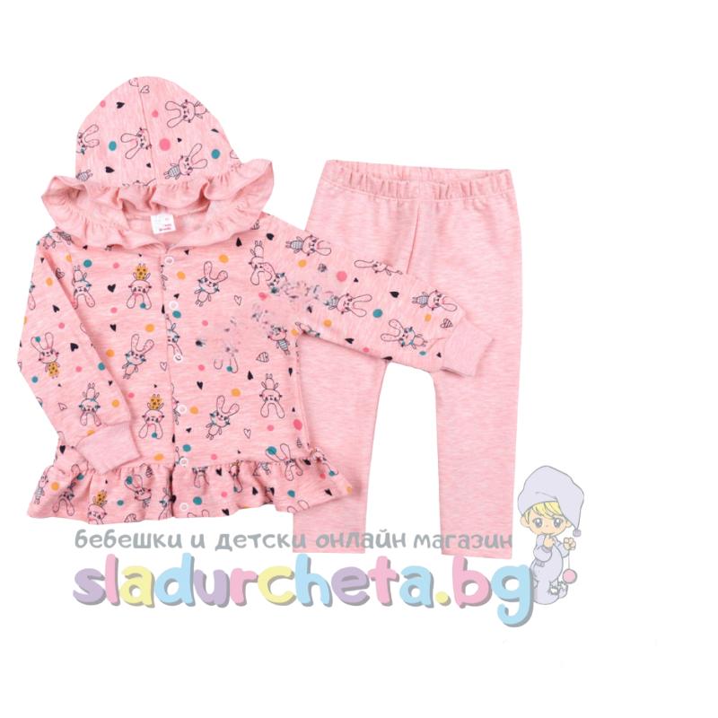 Суитшъртът е с качулка, дълъг ръка в цвят праскова с щампа на зайчета и къдрави акценти на качулката и на талията;