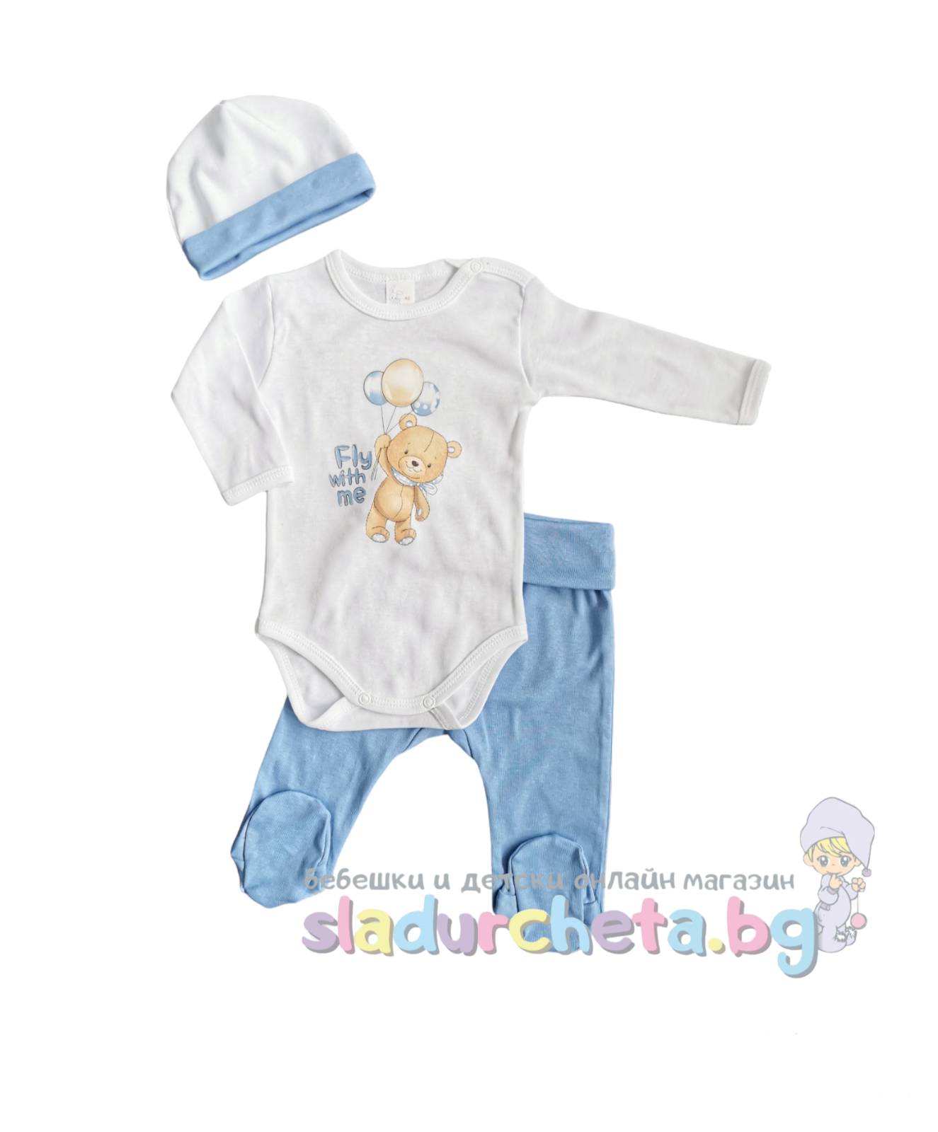 Бебешки и детски магазин "СЛАДУРЧЕТА" и марката "Светли" представят на Вашето внимание бебешки комплект от три части със следните характеристики: