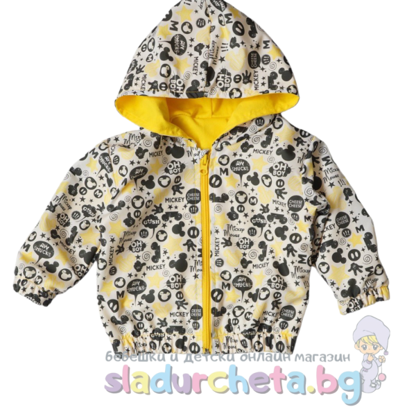 Якето е с дълъг ръкав и качулка в щампиран десен в жълтата гама;