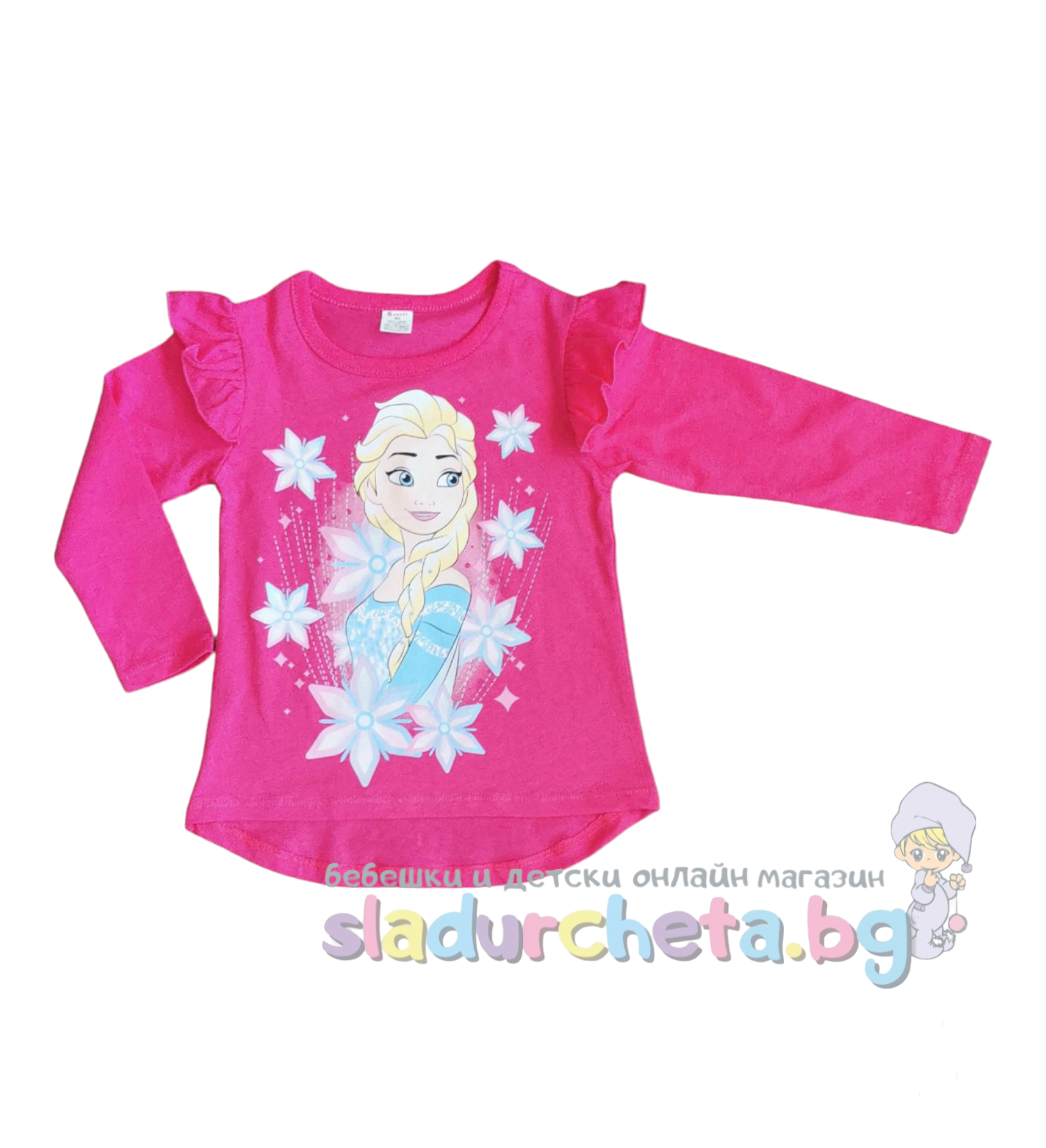 Блузата е с дълъг ръкав, с къдрави акценти на рамената в цвят циклама с апликация на любил герой - Елза;