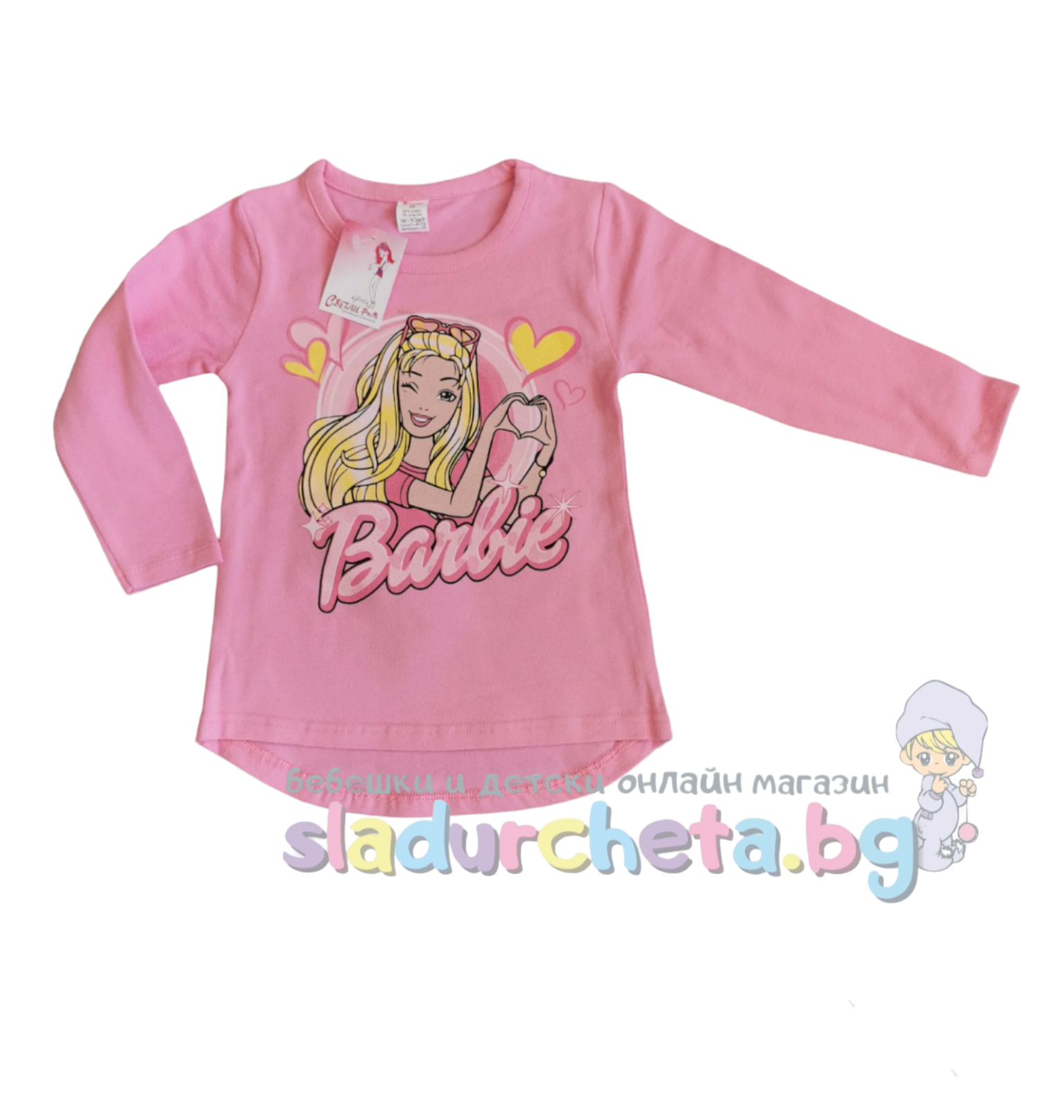 Блузата е с дълъг ръкав в розов цвят и цветна апликация на Барби;