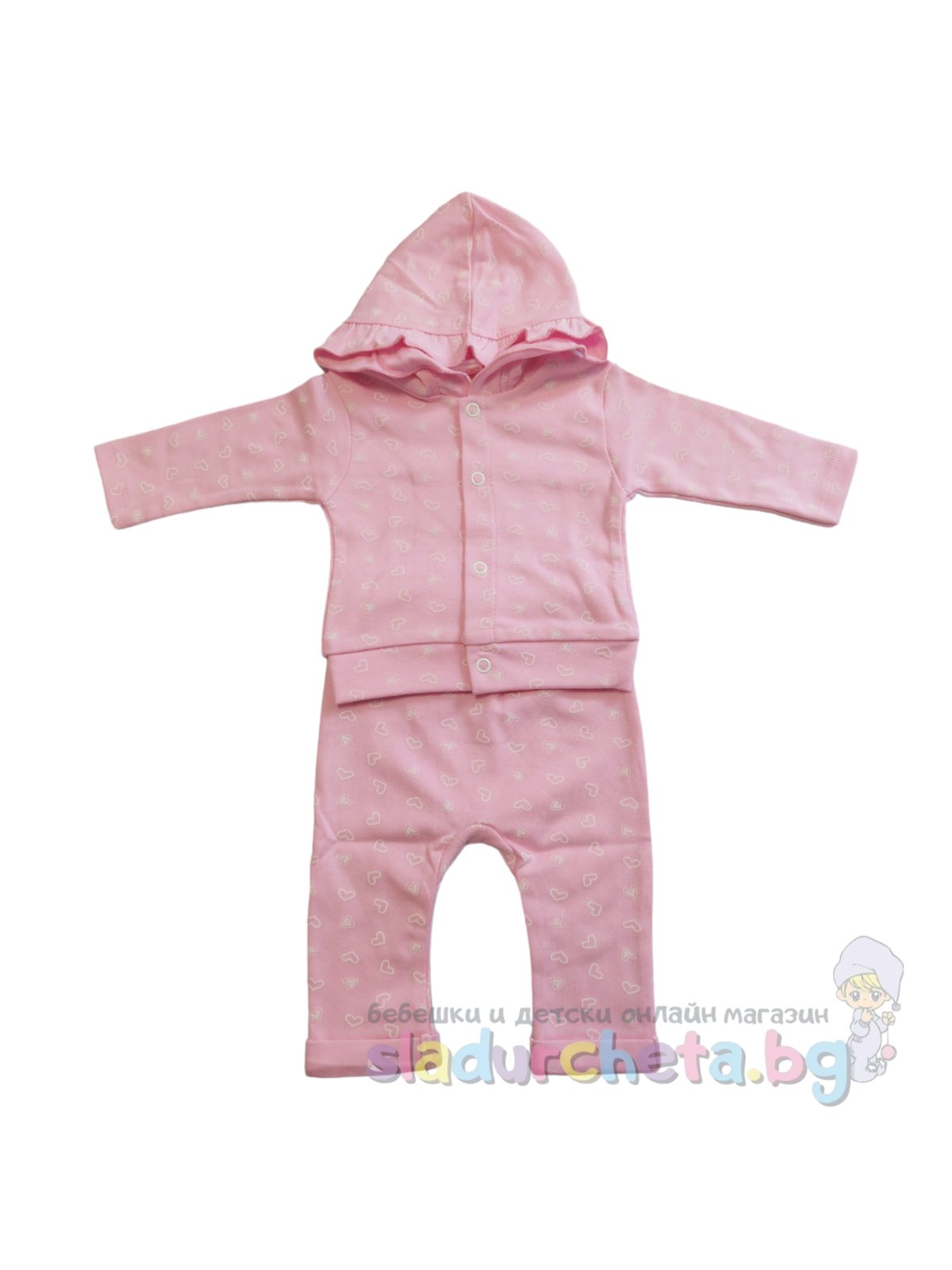 Жилетката е с дълъг ръкав и качулка с къдрави акценти в розов цвят и цялостен принт на сърца;