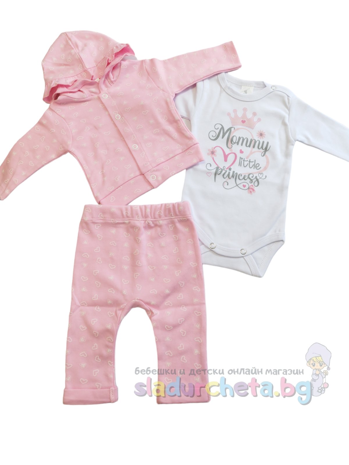 Бебешки и детски магазин "СЛАДУРЧЕТА" и марката "Светли" представят на Вашето внимание бебешки комплект от три части със следните характеристики: