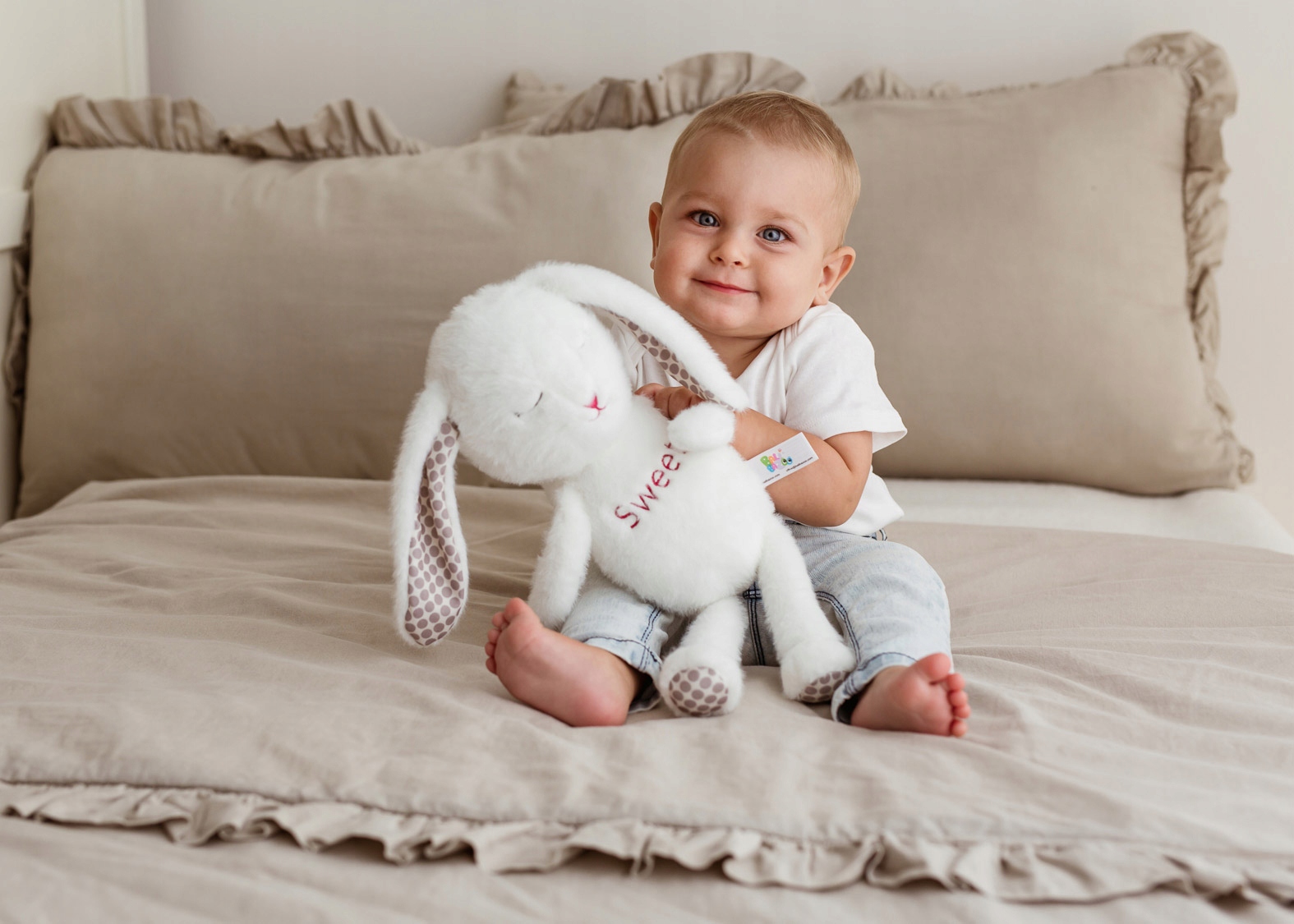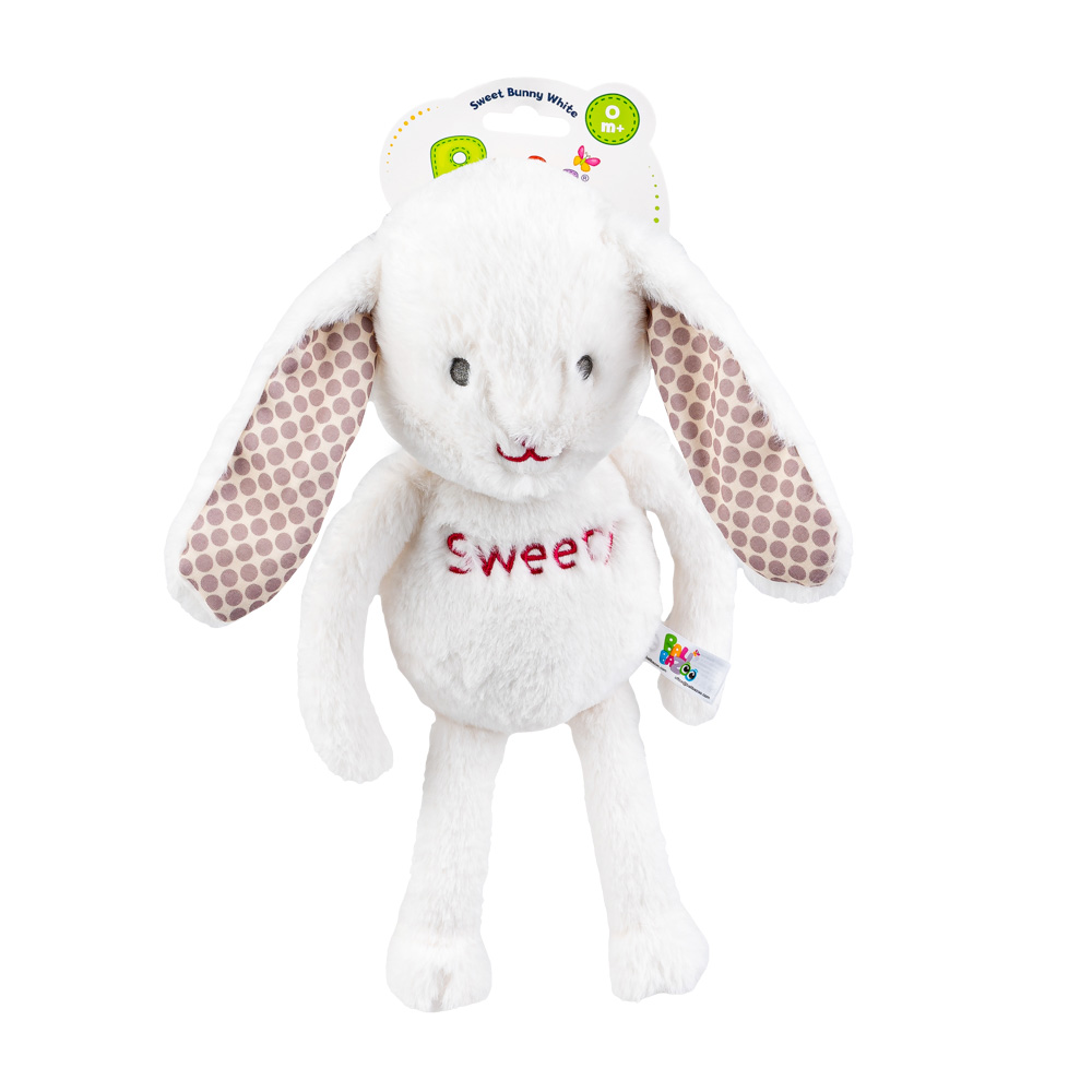 Играчка за гушкане има чифт дълги уши с цветни центрове и приказно пухкава козина;