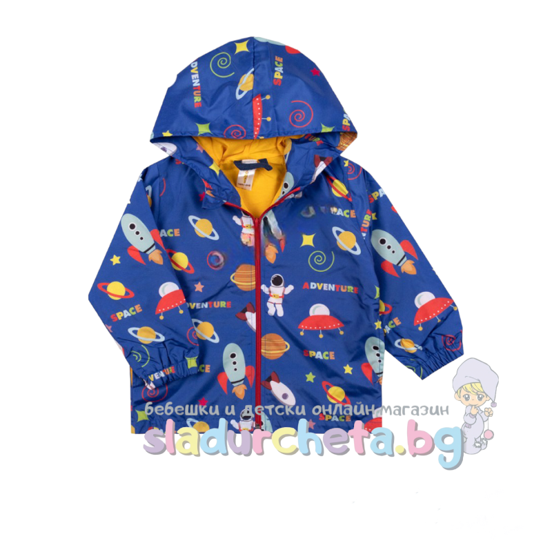Якето е с дълъг ръкав и качулка в щампиран десен на планети в синята гама;