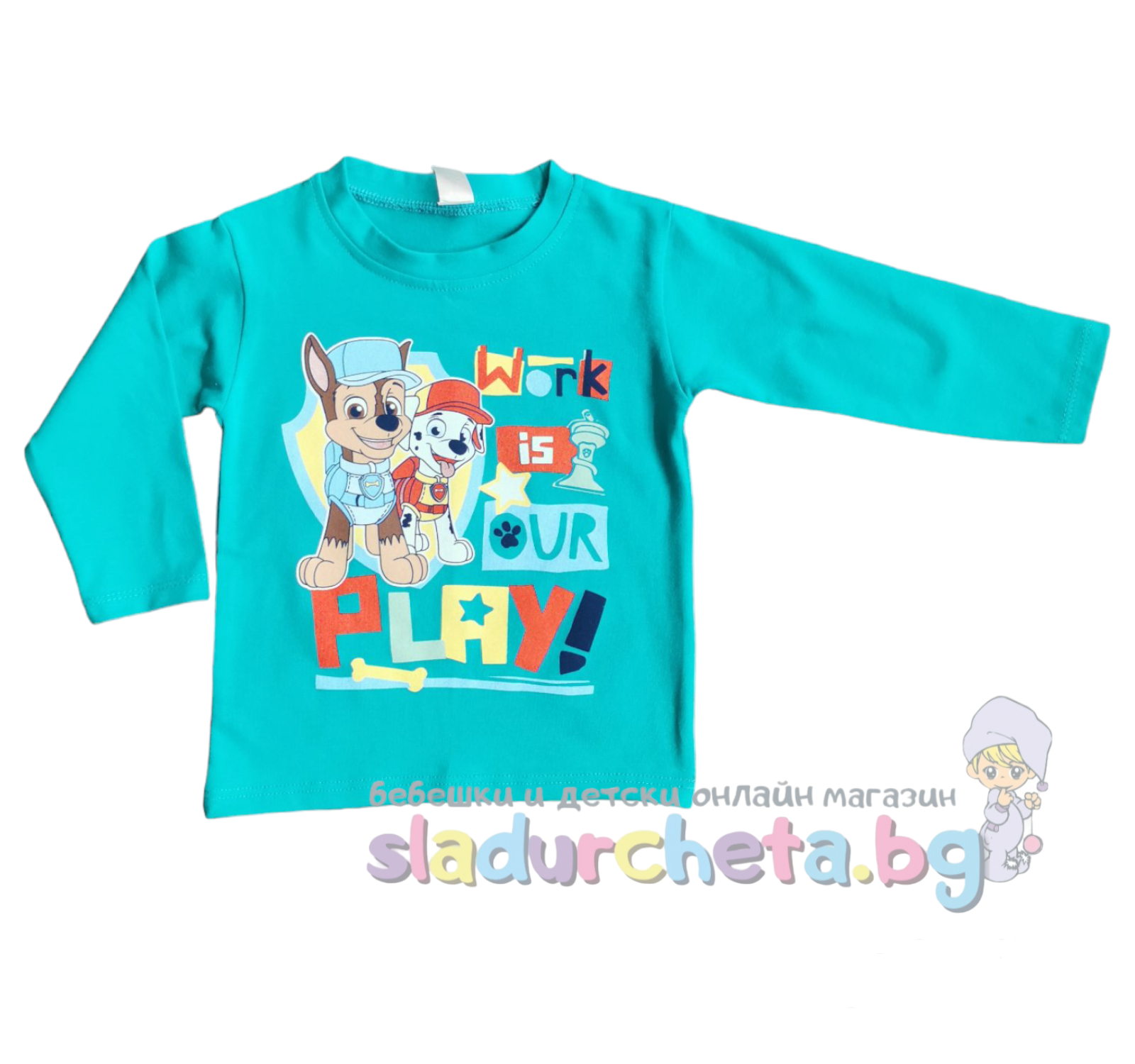 Блузата е с дълъг ръкав в цвят зелен петрол с апликация на Пес Патрул;