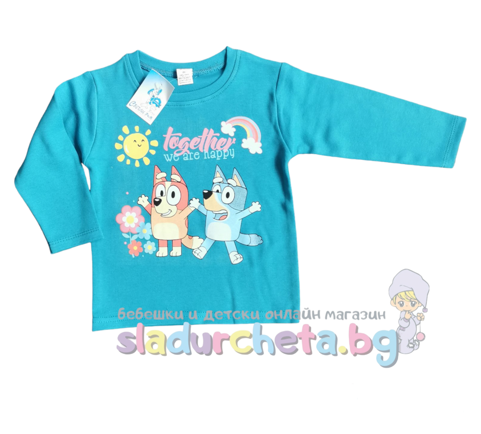 Блузата е с дълъг ръкав в син цвят и цветна апликация на Блуи;