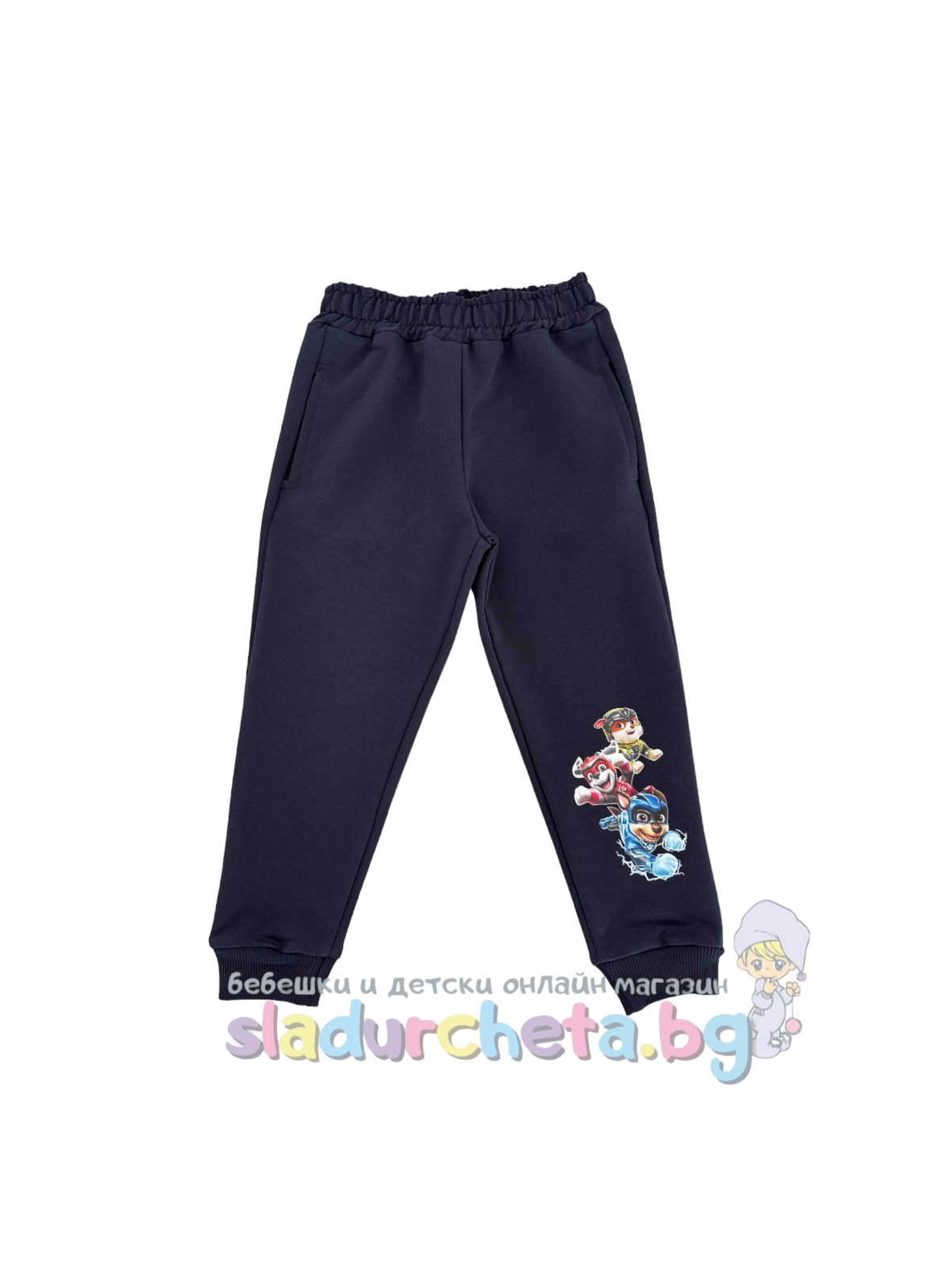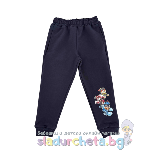 Панталонът е с два джоба с ципове в тъмносин цвят с апликация на Соник и ластична част на талията;