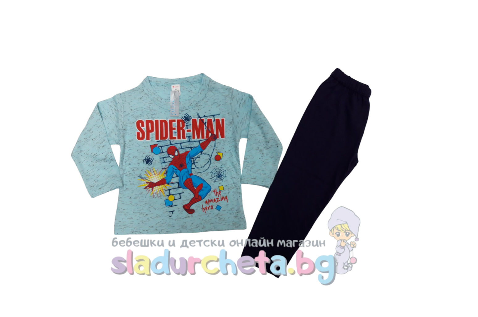 Блузата е с дълъг рокав в светло син цвят с апликация на Спайдърмен;