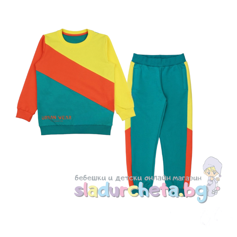 Панталонът е с два джоба в три цвята: жълт, оранжев и зелен петрол и ластична част на талията;