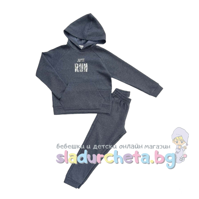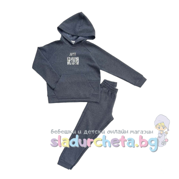 Суитшъртът е с дълъг ръкав, с голям джоб и качулка в тъмно сив цвят;