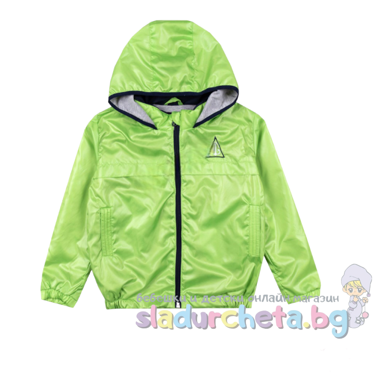 Якето е с дълъг ръкав, с два джоба и качулка в зелен цвят с изчистен дизайн;