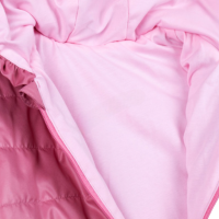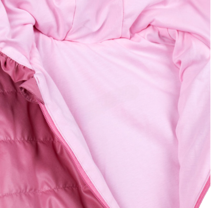 Якето е с дълъг ръкав, с два джоба и качулка с къдрави акценти в розов цвят с изчистен дизайн;