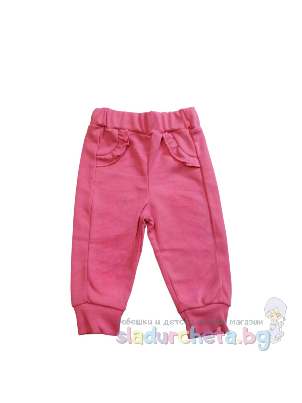 Панталонът е в цвят циклама с къдрави акценти и с ластична част на талията;