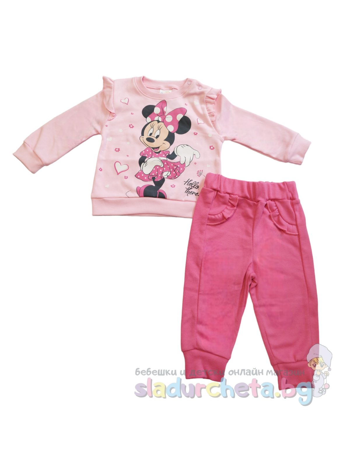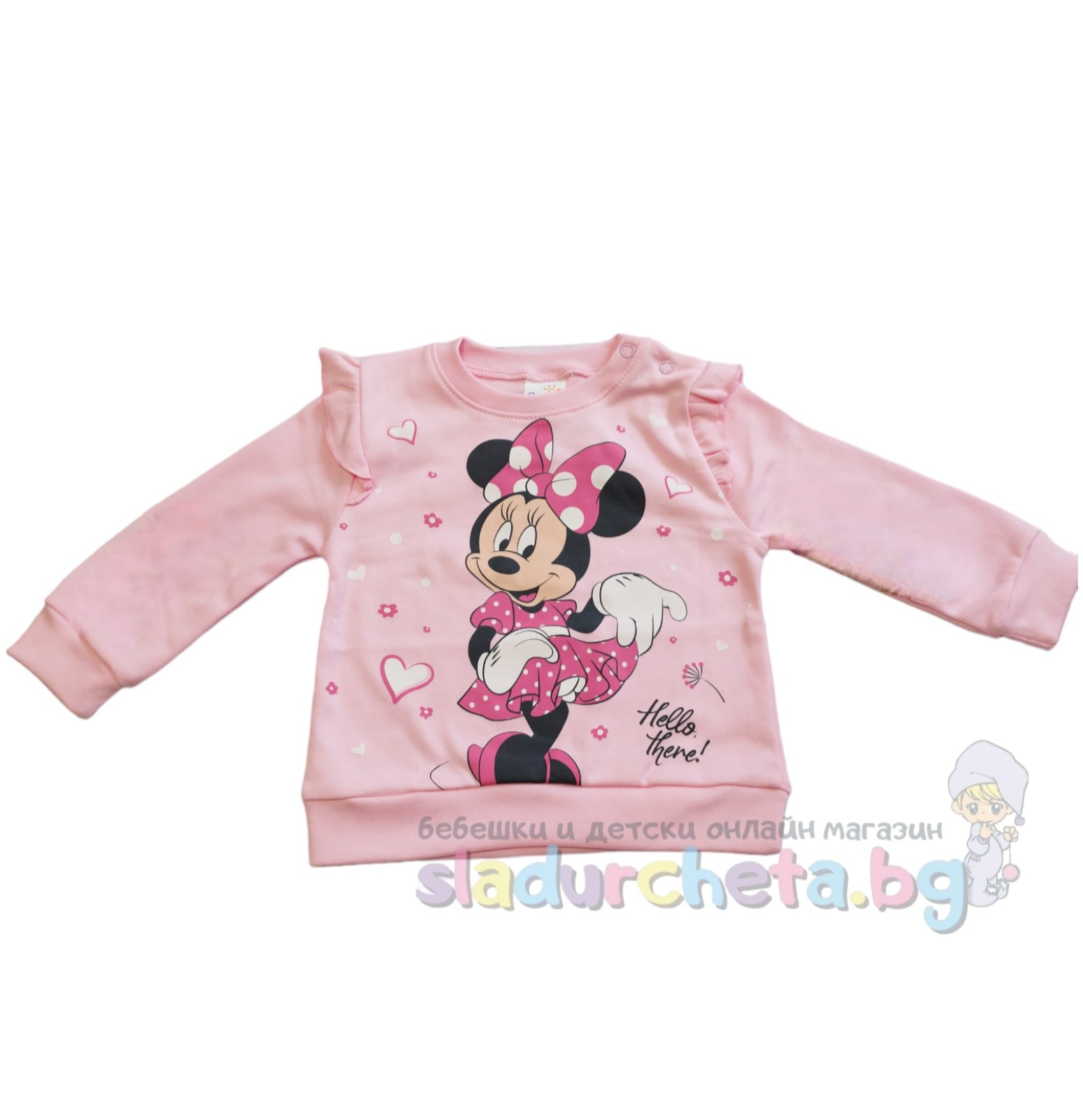 Блузата е с дълъг ръкав и къдрави акценти на рамената в розов цвят с цветна апликация на Мини Маус и щампа на сърца;
