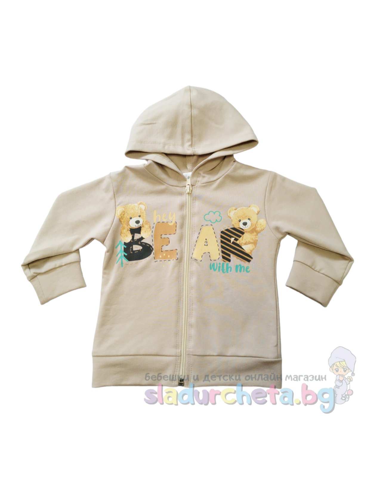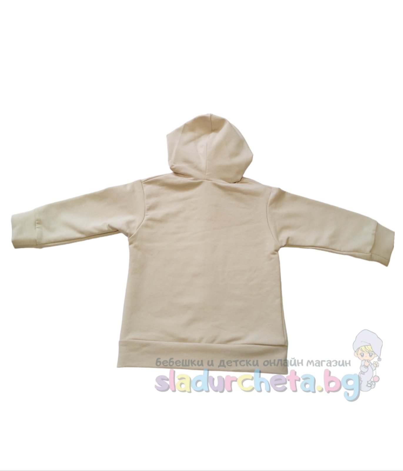 Суитшъртът е с качулка и дълъг ръкав в бежов цвят с апликаця на мечета и надпис;