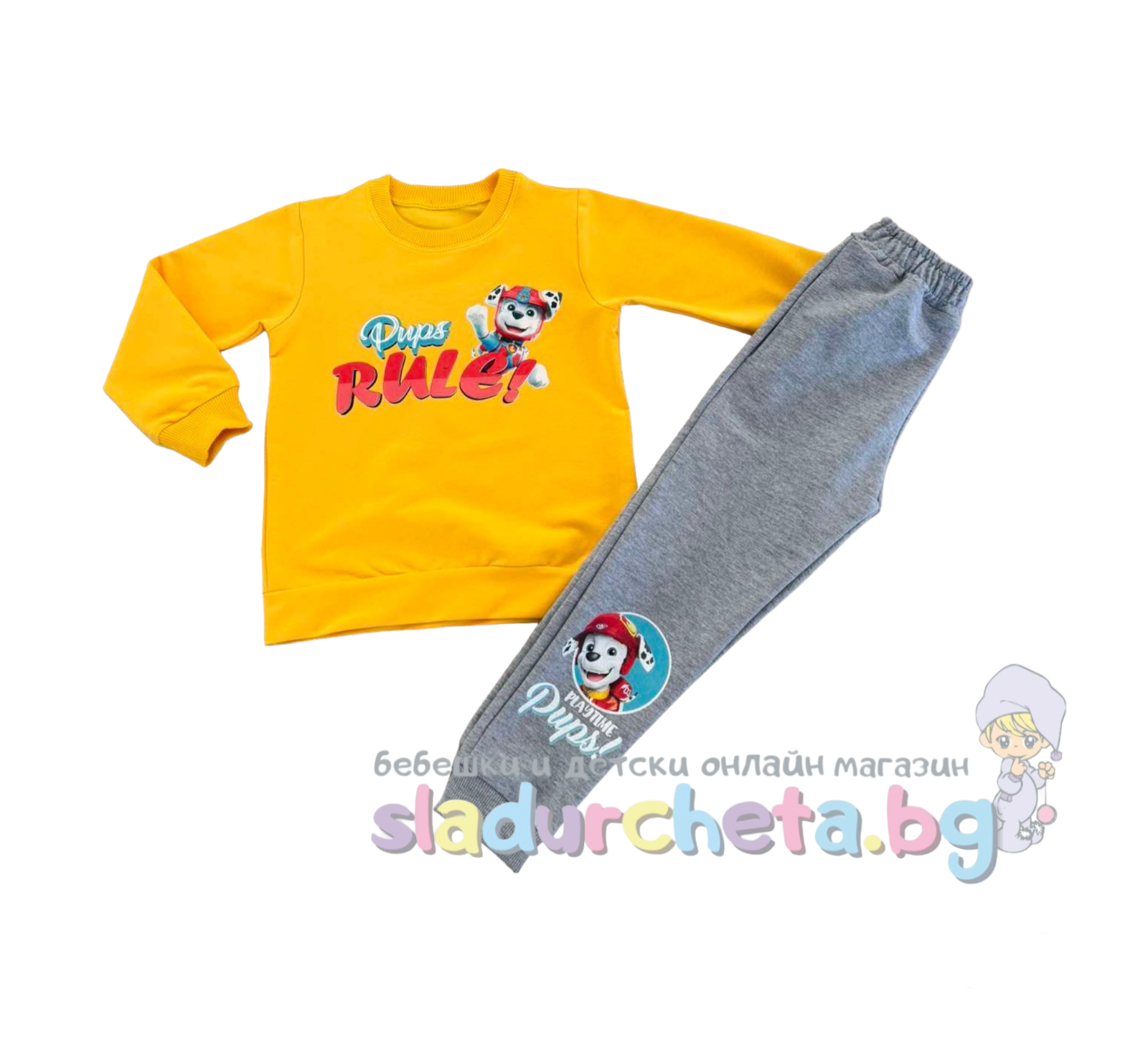 Панталонът е в сив цвят с апликация на Маршъл от Пес Патрул на единия крачол и ластична част на талията;