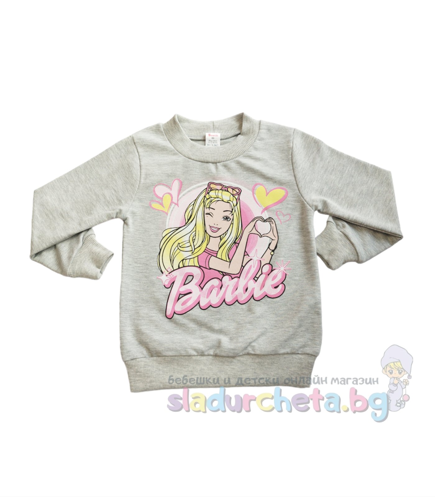 Блузата е с дълъг ръкав в сив цвят и цветна апликация на Барби;