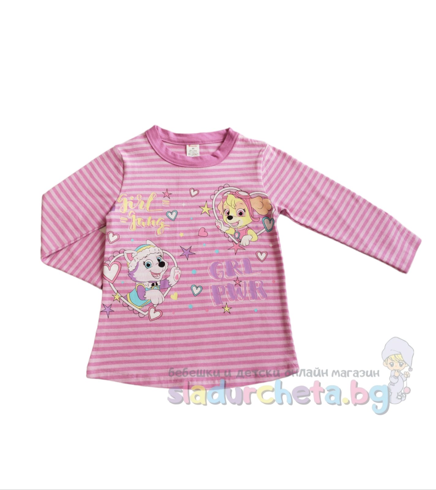 Блузата е с дълъг ръкав на светли и тъмни розови райета с апликация на героите от Пес Патрул;
