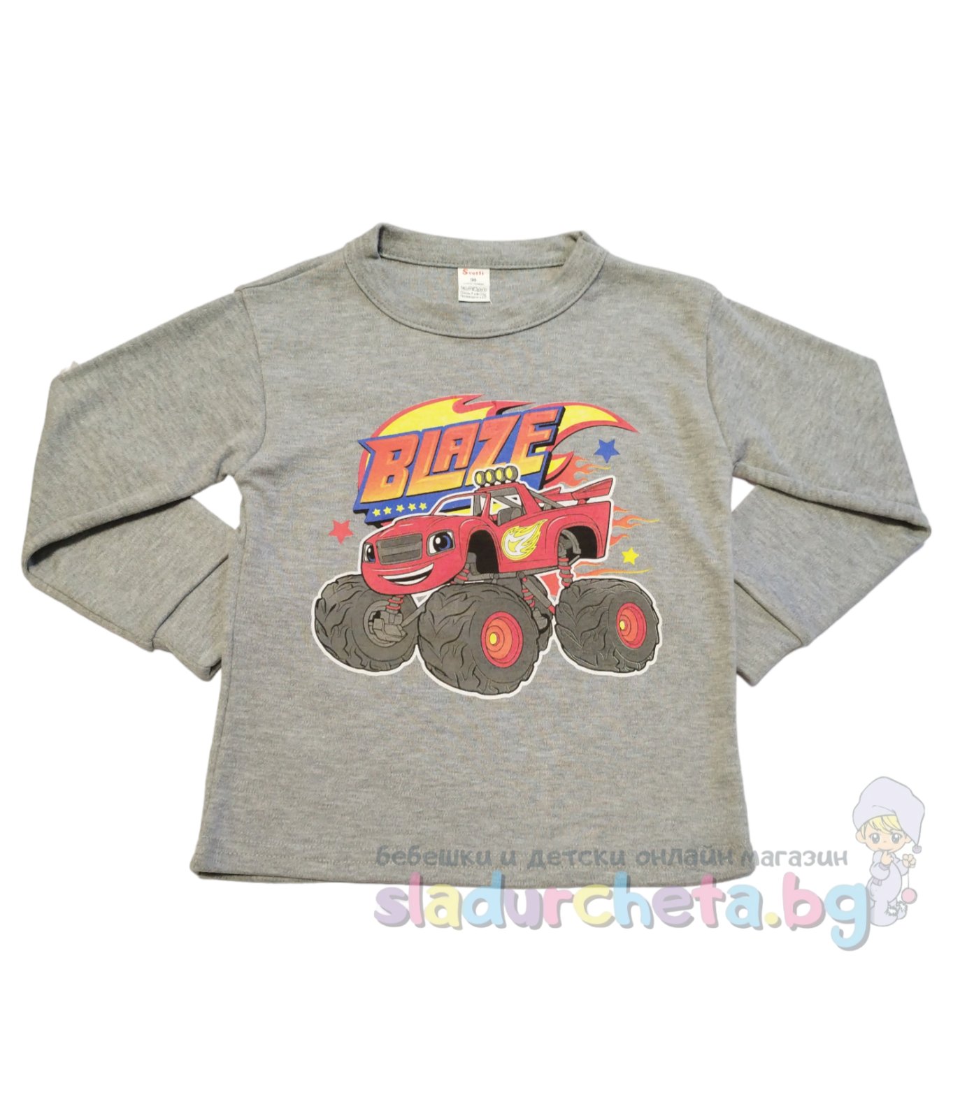 Блузата е с дълъг ръкав в сив цвят с апликация на кола;