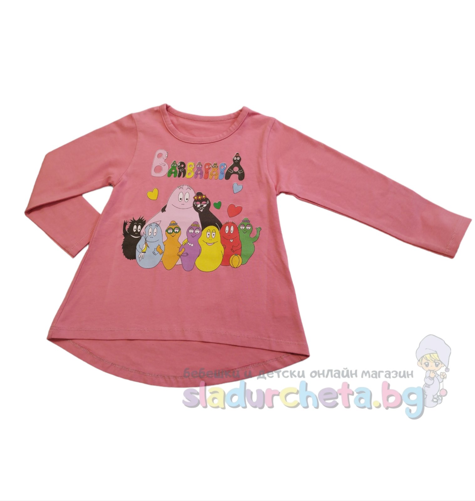 Блузата е с дълъг ръкав в тъмнорозов цвят с апликация на Барбароните;